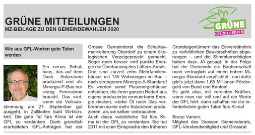 Mein Beitrag für die "Grünen Mitteilungen" (Beilage zum Mitteilungsblatt Zollikofen (MZ) vom 10.9.2020), geschrieben im Hinblick auf die Gemeindewahlen vom 29. November 2020, auch an die Adresse derjenigen Partei, die in ihrem Wahlslogan "Taten statt Worte" propagiert, aber leider oft grüne Taten verhindert... Weitere Infos: www.gfl-zollikofen.ch